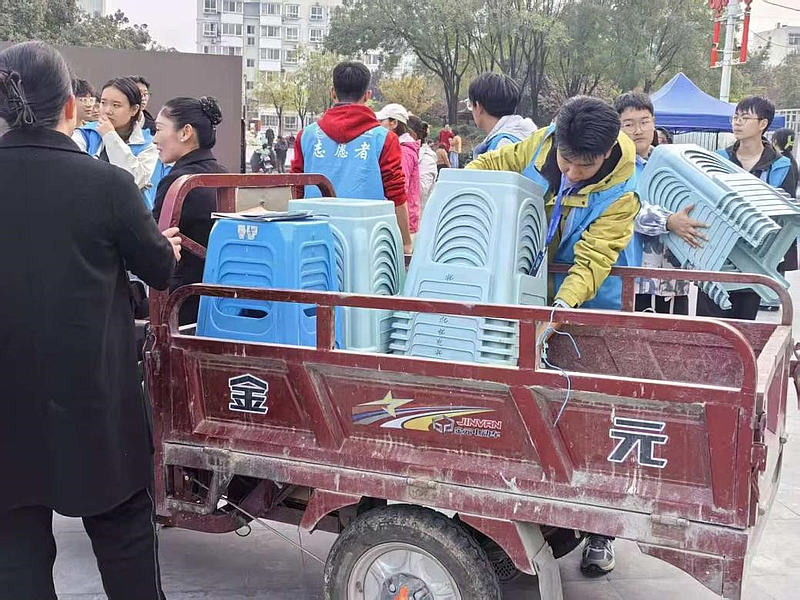 志愿者们主动帮忙收拾座椅
