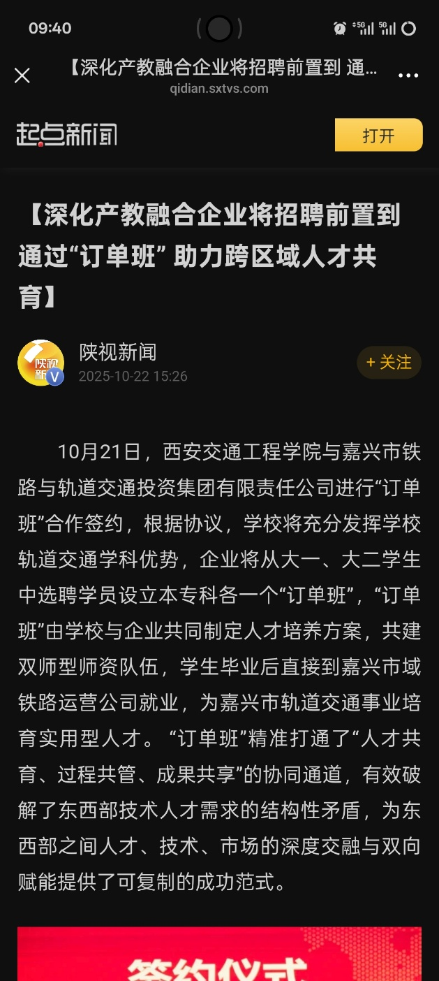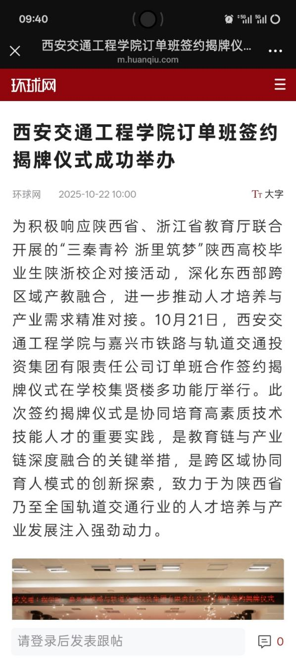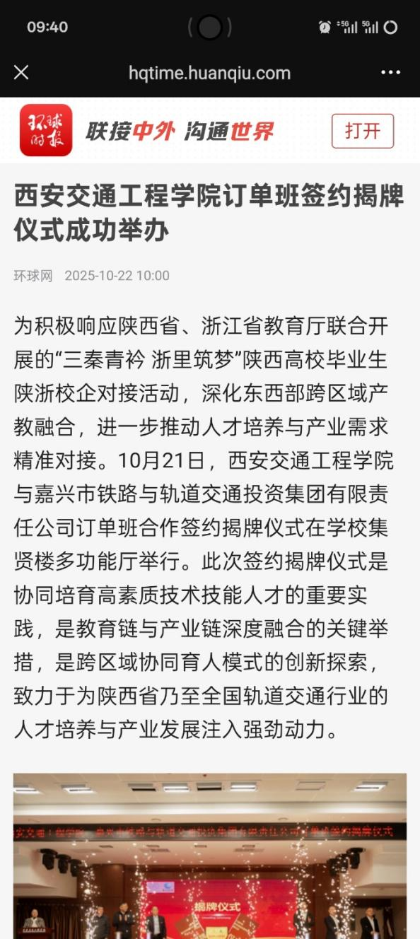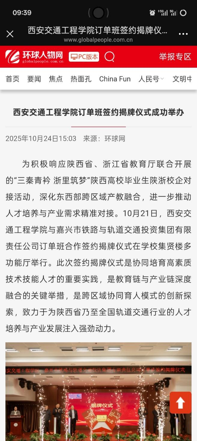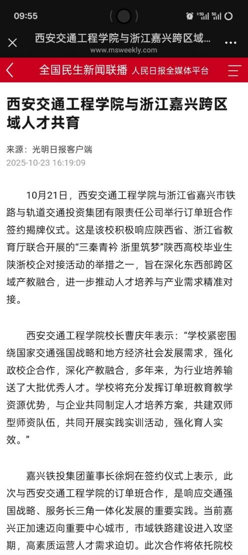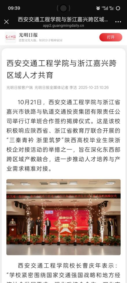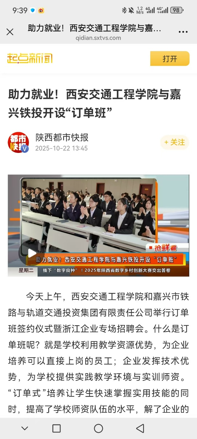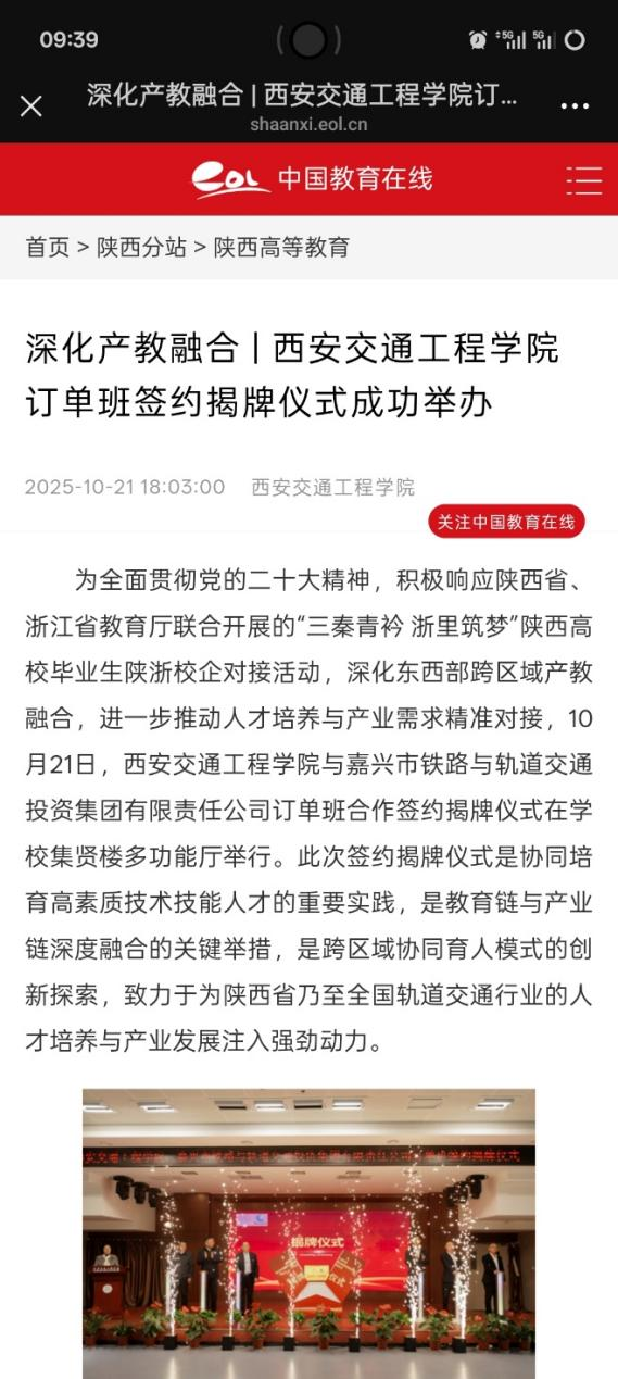 为全面贯彻党的二十大精神,积极响应陕西省、浙江省教育厅联合开展的“三秦青衿 浙里筑梦”陕西高校毕业生陕浙校企对接活动,深化东西部跨区域产教融合,进一步推动人才培养与产业需求精准对接。10月21日,beat365与嘉兴市铁路与轨道交通投资集团有限责任公司订单班合作签约揭牌仪式在beat365集贤楼多功能厅隆重举行。此次签约揭牌仪式是协同培育高素质技术技能人才的重要实践,是教育链与产业链深度融合的关键举措,是跨区域协同育人模式的创新探索,致力于为陕西省乃至全国轨道交通行业的人才培养与产业发展注入强劲动力。
