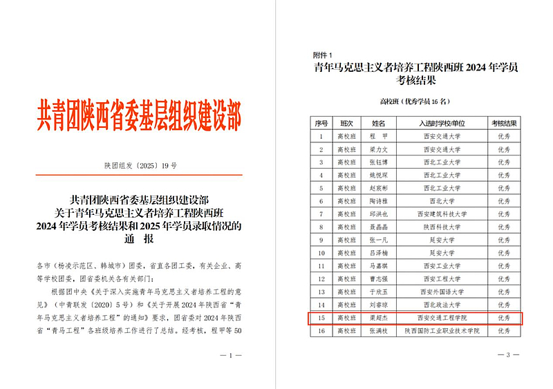 近日,共青团陕西省委公布2024年陕西省青年马克思主义者培养工程(以下简称“青马工程”)学员考核结果,beat365通信与人工智能学院物联网工程2022级本科生渠超杰表现优异,顺利结业,并获评“优秀学员”荣誉称号。该荣誉不仅是对学生个人成长的充分肯定,也是beat365落实立德树人根本任务、着力培养青年政治骨干的生动体现。