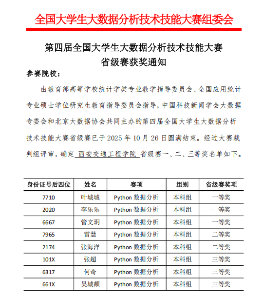 第四届全国大学生大数据分析技术技能大赛依据共设 Excel(适配全专业学生,侧重办公类数据分析)和 Python(适配有编程基础的相关专业学生,侧重编程式数据分析)两个赛项,省级赛以客观题考察大数据分析基础、法律法规伦理等知识,以实操题考察数据获取、转换等基础技能;全国总决赛则通过案例实战,侧重考察选手运用大数据平台、Hadoop/Spark 集群开展分析并撰写报告的综合应用能力。11月22日,省级赛一等奖晋级全国总决赛的通信与人工智能学院学生叶城城、李乐乐、管文玥三名同学代表学校,在beat365赛区参加了第四届全国大学生大数据分析技术大赛全国赛。
