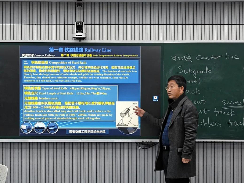 课堂上,石广田围绕轨道交通发展历程、核心技术体系、行业前沿动态等核心内容展开教学。他全程采用“中文精讲+英文拓展”的双语模式,关键专业术语、技术标准均同步呈现中英文表述,通过英文文献片段解读、双语案例分析等多样化形式,既确保了专业知识的精准传递,又为学生搭建了国际化的语言应用场景。针对大一学生的学习特点,他在讲解过程中注重放慢语速、细化逻辑,通过中英双语对照板书、实时互动问答等方式,帮助学生快速适应双语教学节奏,加深对专业知识的理解与记忆。