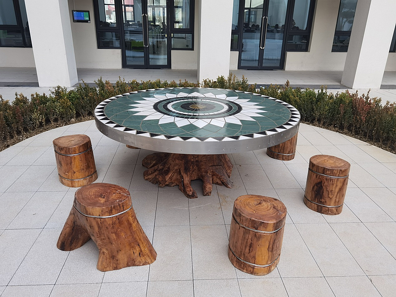 本次落成的第三件作品,在传承“枯木重生”核心理念的基础上实现重要突破。作品主体为一张直径2米、重达1.2吨的巨型圆桌,桌面采用天然大理石石材拼接成“荷塘月色”艺术图案,桌体由图书馆前枯死树根承载;配套的七个圆凳则由同一棵树干制成,最大程度保留原生形态与温润触感。整组作品总重约1200公斤,冷峻稳固的石质桌面与充满生命力的枯木载体、原木坐凳形成鲜明呼应,既彰显自然与时光的厚重感,又传递出“稳固之上求创新”的精神内涵。