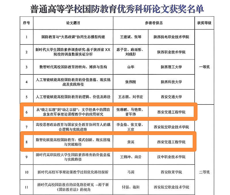 此次获奖的两篇论文,密切围绕新时代高校国防教育的关键议题与挑战,重点聚焦于国防教育课程创新与实践育人模式探索等前沿领域,坚持理论与实践相结合,深入探讨了深化教学创新、推进课程思政融合以及数智化赋能教育等核心问题,充分彰显了中文教研室长期以来秉持以研促教、教研相长的优良传统与学术积淀。此项佳绩的取得,既是两位教师深耕教学领域、潜心学术研究的理论结晶,也是部门与教研室长期致力于团队建设、营造浓厚科研氛围的集中体现,更是学校对国防教育工作高度重视与持续投入的成果体现。