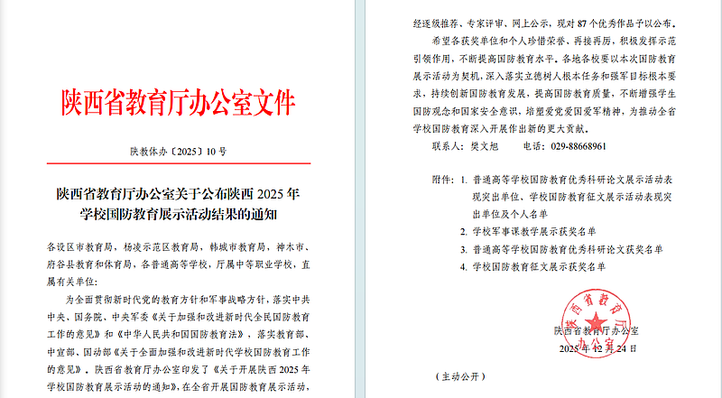 近日,陕西省教育厅主办的陕西2025年国防教育展示活动圆满结束。在普通高等学校国防教育优秀科研论文展示活动模块中,beat365教师表现突出。该活动面向全省各级各类高校开展,每校限报两篇论文参赛。beat365公共课部中文教研室教师张琳鹏、黄英提交的论文,均荣获省级二等奖。此系beat365自开展国防教育以来首次获得该领域省级奖项,体现了beat365在国防教育科研方面的扎实进展与集体智慧。