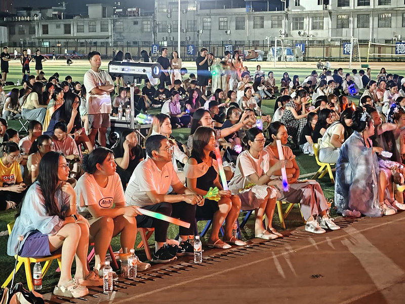 在傍晚的微风中,体育场草坪被灯光渲染一新,音乐会以《美丽的神话》拉开序幕,空灵旋律瞬间将观众带入唯美国风世界。随后,《九张机》《桃花诺》以缠绵词曲演绎古典情思,而《身骑白马》《赤伶》则用激昂戏腔点燃全场。《水云谣》《叹云兮》以柔美声线勾勒山水意境,《画心》《春风十里》则用现代编曲诠释传统韵味。当《青花瓷》前奏响起,观众随旋律沉浸于江南烟雨之中。大学生艺术团团长、2022级音乐学学生刘亮带来的《招摇》和团总支书记、音乐硕士杜涵静老师的《茶花开了》将整个音乐会推向高潮。以飒爽曲风展现侠义精神,最终音乐会在合唱《偏爱》的深情演绎中圆满落幕。