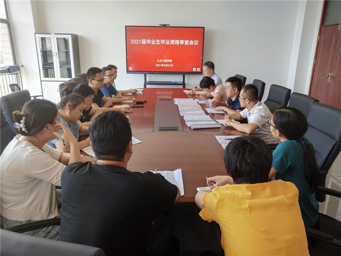 ——做好毕业生毕业资格审查。6月21日下午,土木工程学院在校务楼516会议室召开毕业生毕业资格审查会议。该院党总支书记兼副院长王鹏、副院长杨瑞娟、梁腾飞、教研室主任、教学秘书、毕业设计(论文)指导教师、毕业生辅导员参加会议,会议由张院长主持。会上,教学秘书薛婉婷老师首先汇报了对2021届毕业生学习成绩的审查情况;各毕业设计(论文)答辩组负责人汇报了各组学生答辩考核情况。参会人员对达到毕业条件和未达毕业条件的学生逐一审核,集体讨论表决并将最终结果呈报学校教务处。张院长强调,要认真审核毕业设计(论文),各项材料要准备齐全,包括纸质档案和电子档案,收集齐全并妥善归档;对审查结论为结业和免授学士学位的学生情况要逐项查实写清原因,并将审查结论告知学生,做好学生的思想工作;要细致周全地做好2021届毕业生离校前的每项工作,充分顾及毕业生的感受,让学生们深刻地体会到母校的关怀。