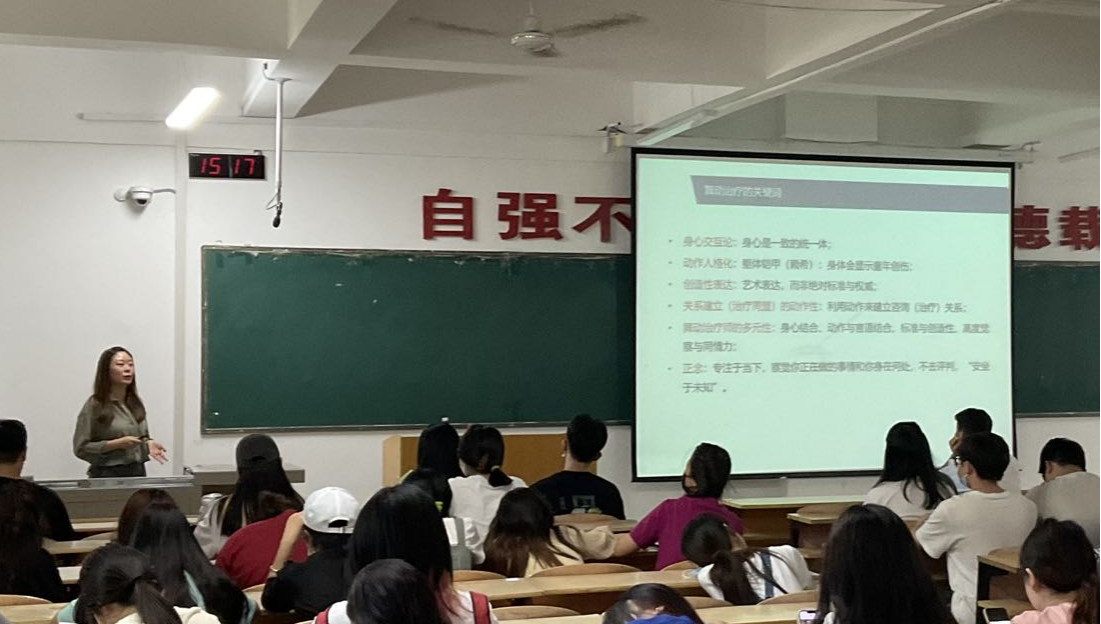 讲座上,王老师从一个简洁的视频开始,讲解了舞动治疗法。舞动治疗是以动作的过程作为媒介的心理治疗,即运用舞蹈活动过程或即兴动作的促进个体情绪、情感。身体、心灵、认知和人际等层面的整合,既可以治疗身心方面的障碍,也可以增强 个人意识 ,改善人们的心智。她从历史背景,理论建立,发展历程的许多方面详细阐述了舞动治疗法的发展历史,简单讲述了舞动治疗的作用。使心理创伤等心理障碍起到促化分解和消除作用。