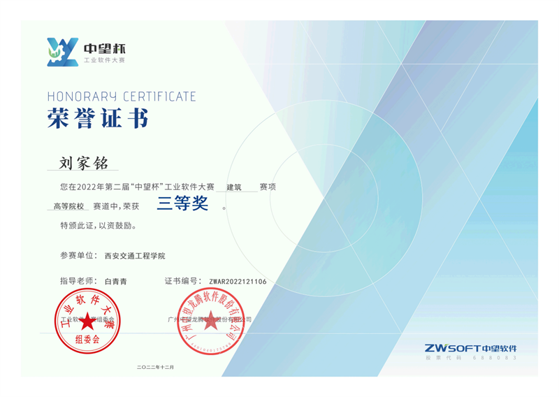 在备赛阶段,土木工程学院刘家铭和徐子梵同学在白青青老师的悉心指导下,认真研究赛项规程,夯实制(识)图基础知识,不断提升二维、三维制图技巧。凭借扎实的专业基础、过硬的技能素养、良好的心理素质,沉着应赛,最终参加了全国总决赛。经过激烈的角逐,刘家铭和徐子梵同学分别获得全国总决赛三等奖。