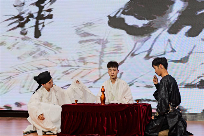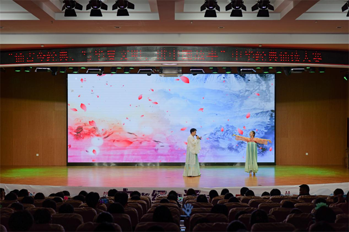 比赛在人文与管理学院同学们衣袂飘飘的国乐经典《双面燕洵》的舞蹈中拉开帷幕,同学用袅袅婷婷的身姿演绎了一位从阳光明媚到跌入谷底奋起反抗的少年郎,给现场观众带来艺术美的享受。诵读从气势恢弘的《满江红》到反映民众疾苦的《卖炭翁》,从浪漫诗的极致《将进酒》体味李白的“盛放与孤独”,从《茅屋为秋风所破歌》凝视现实主义集大成者杜甫“以天下为己任”的自然天性,一首首千古绝唱承载了中华民族的千年文化,沉淀于历史的长河,又升华于现代的社会,是中华民族不朽的篇章。同学们个个精神焕发、饱含激情诵读了《琵琶行》、《声声慢》、《出师表》等经典国学篇目,参赛选手或慷慨激昂,或低声吟唱,或娓娓道来,酣畅淋漓的抒发了自己的家国情怀,精彩的表演赢得经久不息的掌声和喝彩,让现场的评委与观众为之惊叹。大赛在国风歌伴舞《不染》中圆满结束,呈现了一台当代大学生展示国学经典文化的视听盛宴。
