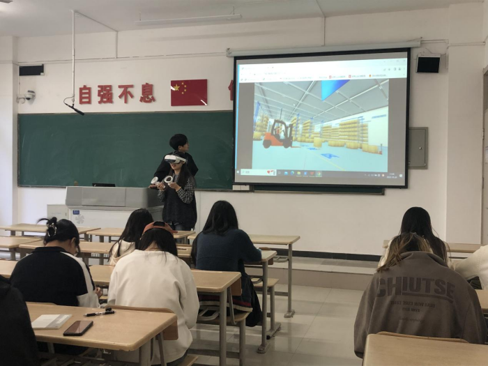 课程伊始,老师为大家详细解读了课程的核心内容,从制造业到销售企业,再到供应商,物流企业,综合服务、政务中心等每一个公司具有独特的运营模式和挑战。为让同学们身临其境般的感受真实实训场景,寓教于乐,提高同学们学习的积极性,老师为同学们带来了AIE智境的VR眼镜体验,同学们跃跃欲试,争先体验。