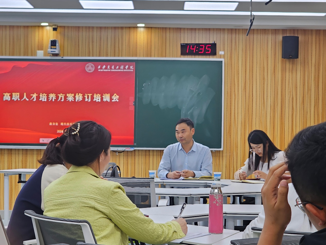 4月24日下午,现代技术学院在智慧教室开展了高职人才培养方案修订培训会。特别邀请了西安铁路职业技术学院交通运输学院的副院长刘新强,陕西铁路工程职业技术学院教务处副处长杨勃与我院各个专业带头人进行交流,现代技术学院都院长主持此次培训会。