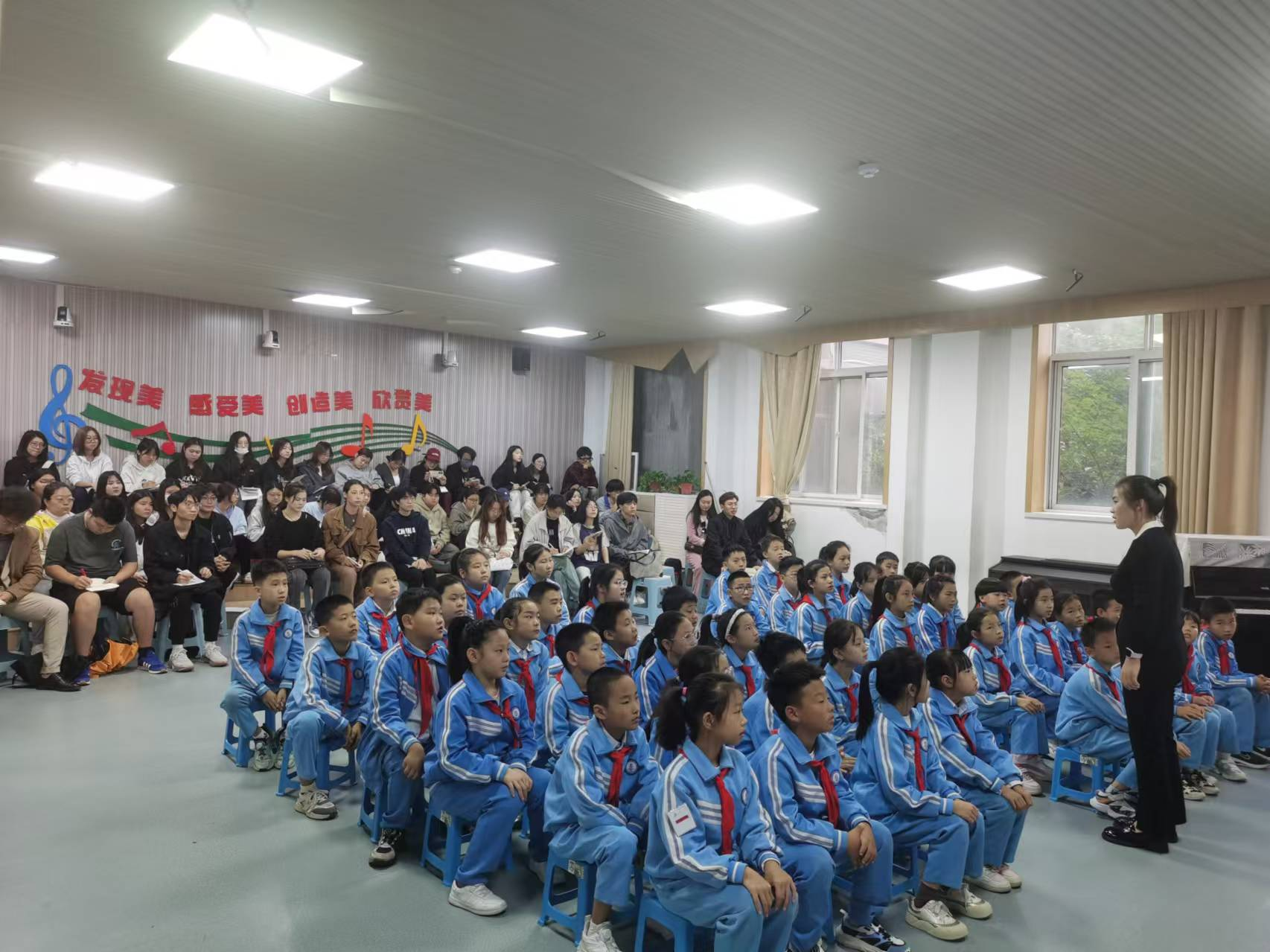 为进一步提升音乐学专业学生的教育教学实践能力,促进对音乐先进教学理念的吸收与融合,提高教学技能与技巧,10月12日,人文与管理学院音乐学教研室组织本科二年级及专升本一年级的学生,前往鄠邑区西安滨河荣华实验小学进行了一次富有成效的集中教育见习。