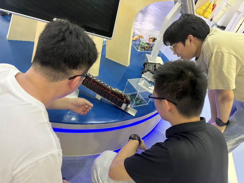 随后,师生们参观了园区科技成果展。两位老师结合展出的获奖作品,从技术突破、应用场景、社会价值等角度进行详细讲解,引导学生思考创新背后的逻辑。