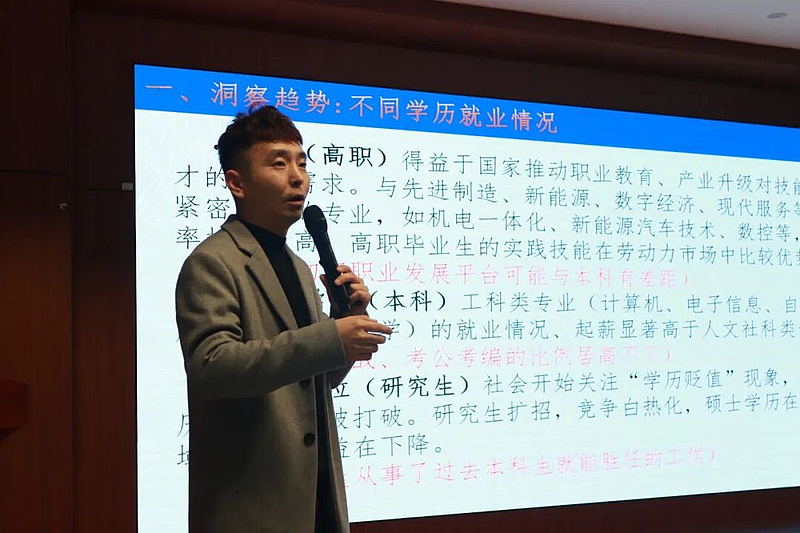 针对不同学历群体的就业差异,关龙老师的解读更具针对性:高职(大专)毕业生受益于职业教育与产业需求的紧密对接,在机电一体化、新能源汽车技术等技能型领域就业率持续走高,“实践能力是他们在劳动力市场的核心优势”;本科毕业生中,工科、应用理科(如计算机、电子信息)的就业起薪与机会显著优于人文社科类,但“考研二战、考公考编的选择比例居高不下,反映出大家对就业稳定性的迫切诉求”;而硕士研究生则需正视“学历贬值”现象——随着研究生扩招,学历的边际效益逐渐下降,“部分硕士毕业生甚至需要与本科生竞争基础岗位,企业招聘愈发理性,更看重专业与产业的契合度”。“学历的‘保值期’在缩短,能力的‘有效期’才是职业发展的长久底气。”这一观点让在场学子对自身定位有了更清醒的认知。