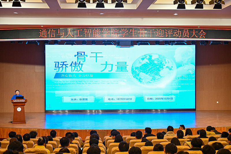 为全面迎接教育部本科教学合格评估工作,进一步凝聚学生骨干力量、明确迎评责任,12月4日,通信与人工智能学院于学校学术报告厅召开学生骨干迎评动员大会。会议由张雯雯主持,学院全体学生党员、预备党员、入党积极分子,各班级班委,院级学生组织主要干部,在校学生会及团委任职的学院学生骨干与全体辅导员参会。