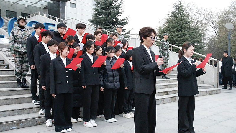 升旗仪式结束后,学生干部进行了庄重的宪法朗诵,清朗而坚定的诵读声回荡在升旗广场上空,一字一句都饱含着对宪法的尊崇与敬畏,让在场师生再次感受到宪法的庄严与神圣,法治的力量与信仰也在声声诵读中悄然浸润人心。