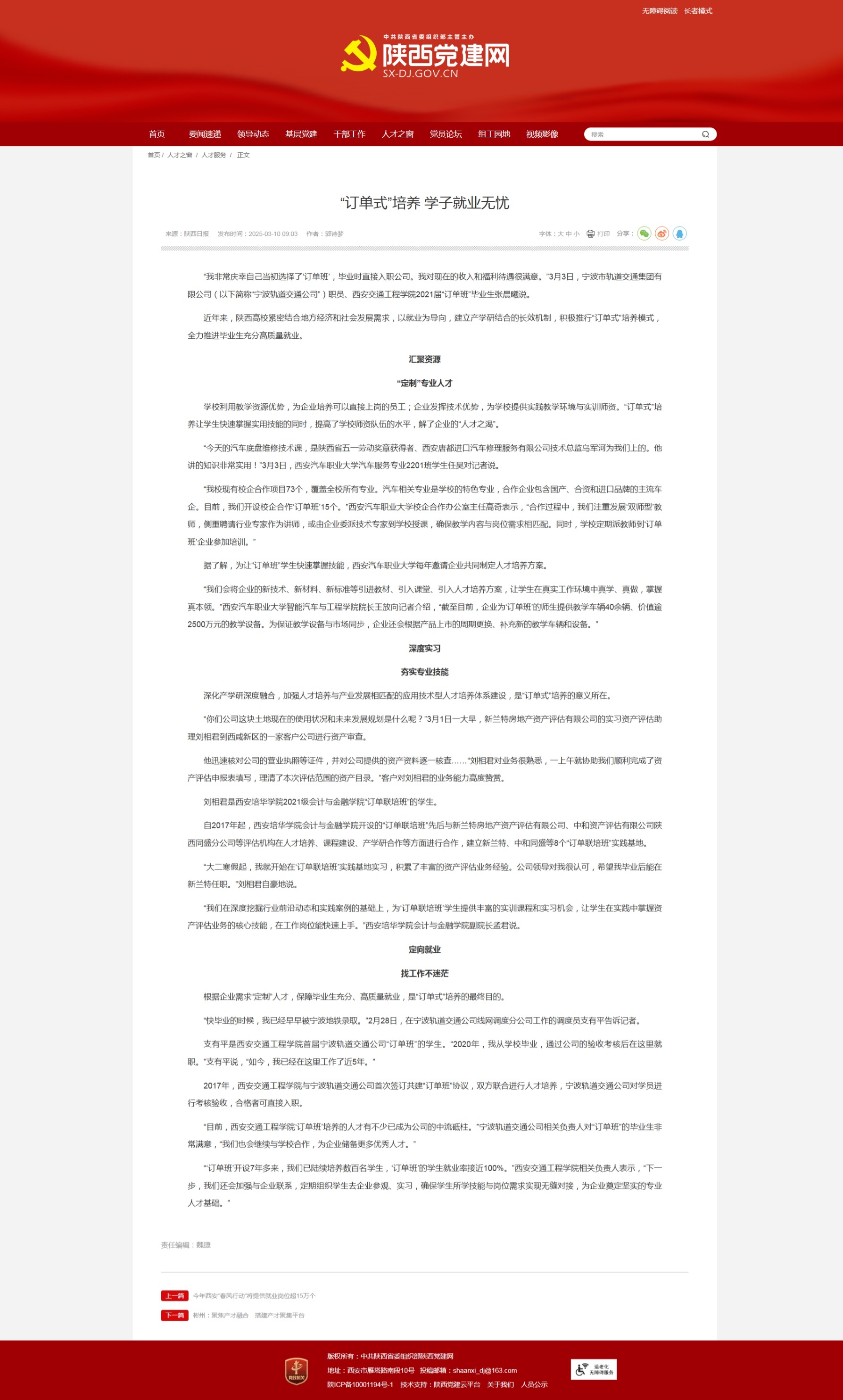 陕西党建网:“订单式”培养 学子就业无忧