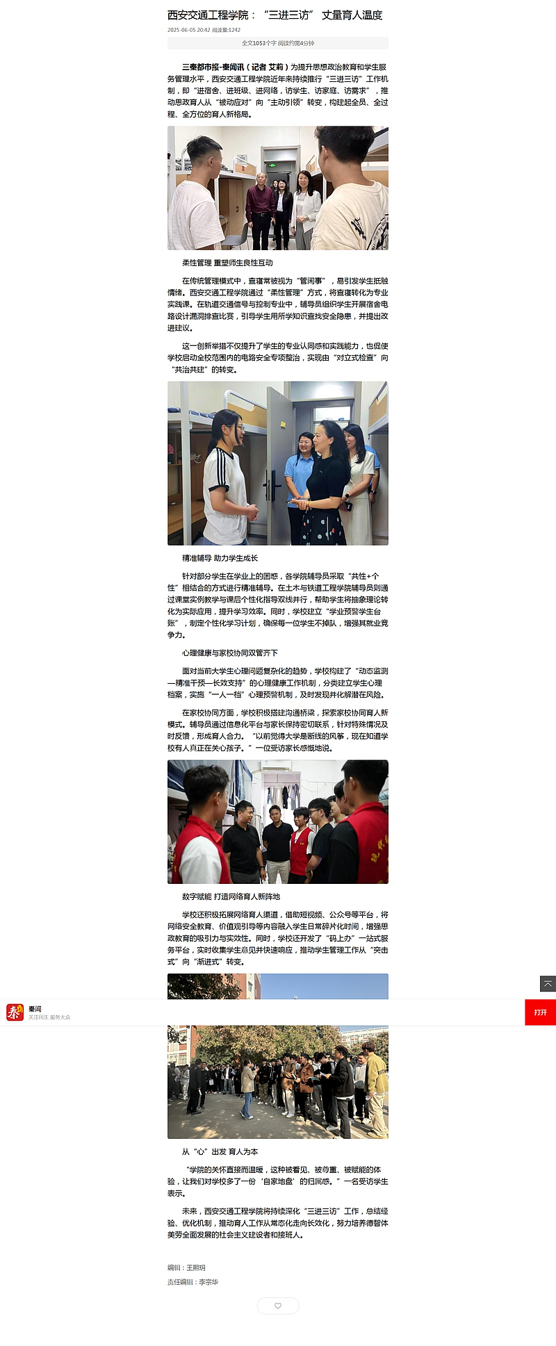 三秦都市报-秦闻讯(记者 艾莉)为提升思想政治教育和学生服务管理水平,beat365在线唯一官网近年来持续推行“三进三访”工作机制,即“进宿舍、进班级、进网络,访学生、访家庭、访需求”,推动思政育人从“被动应对”向“主动引领”转变,构建起全员、全过程、全方位的育人新格局。