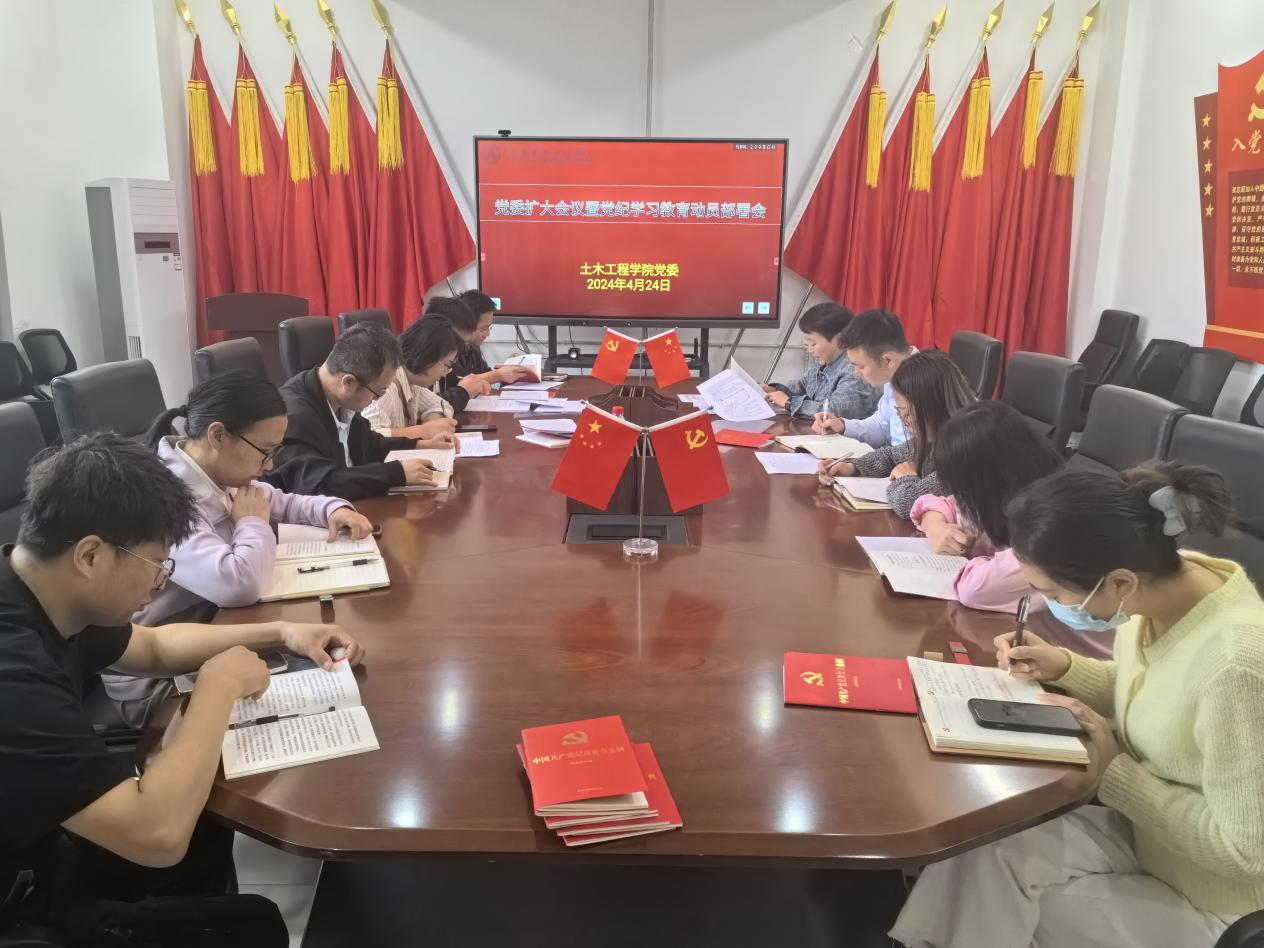 4月24日上午,土木工程学院在崇文楼3-212党员活动室召开了党委扩大会议暨党纪学习教育动员部署会,传达学习习近平总书记关于开展党纪学习教育的重要讲话和重要指示精神以及学校有关部署要求,启动部署土木工程学院党纪学习教育工作。土木工程学院党委委员、各支部委员参加会议,会议由土木工程学院党委副书记张雯雯主持。