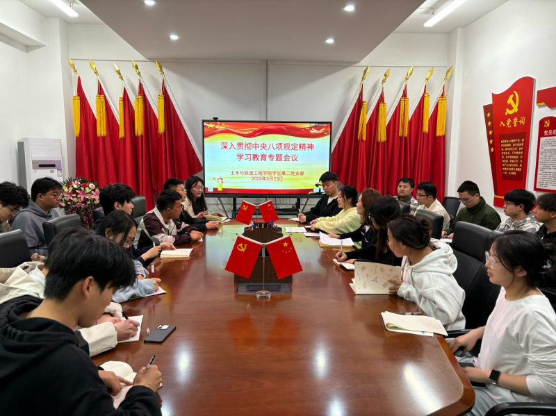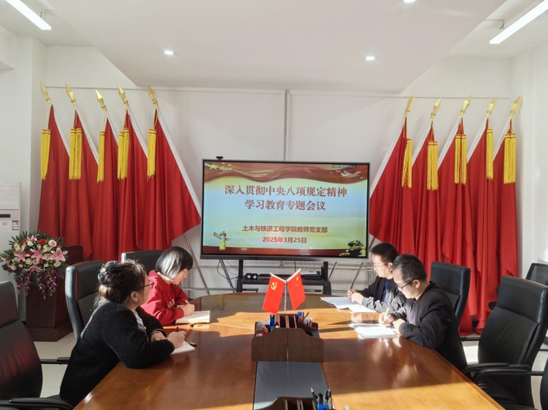 3月25日下午,土木与铁道工程学院在崇文楼3-212党员活动室召开了深入贯彻中央八项规定精神学习教育动员部署会,全面落实学校关于深入贯彻中央八项规定精神学习教育工作的部署要求。该院党委委员、各支部委员参加了会议,党委书记张雯雯主持会议并作动员讲话。